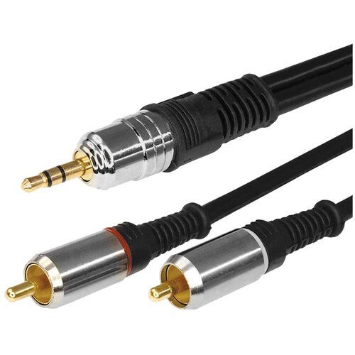 Шнур 3.5 Stereo Plug - 2 RCA Plug 3 м (GOLD) металл REXANT предназначен для передачи аналогового аудиосигнала и широко применяется для видео- и аудиосистем. С одной стороны шнура располагается штекер разъема 3.5 Stereo, а с другой — 2 штекера разъема RCA (традиционный стандарт для аналоговой видео- и аудиотехники).
