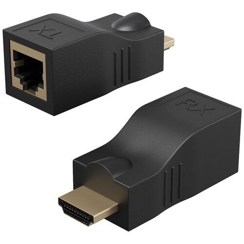 Удлинитель HDMI на 30м по витой паре (Ethernet кабелю, кабелю UTP) комплект из трансмиттера и ресивера. Комплект трансмиттер (отправляющее устройство) и ресивер (принимающее устройство) для удлинения HDMI сигнала по витой паре / кабелю Ethernet с коннекторами RJ45. Поможет вывести видеосигнал на большую длину, нежели обычный HDMI кабель, а также удобно спрятать кабель, ведь витая пара гораздо тоньше и более податлива в укладке в кабель каналы. Удобен для вывода сигнала для видеонаблюдения. Поддержка технологии Plug&Play. Работает на cat5e/6 с разрешением до 1920x1080 на расстояние до 30 метров (только кабели категории 6). Примечательно, что дополнительный источник питания вам не потребуется. HDMI приемник и передатчик, решает многие проблемы передачи видеосигнала, экономит денежные средства для покупки длинного HDMI кабеля. В общем, прекрасное решение для торговых выставок, учебных заведений, загородных домов и везде где можно сократить расходы на длинном HDMI кабеле.