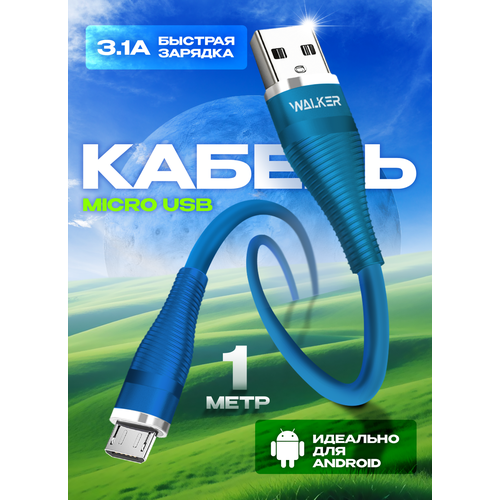 НАЙТИ ВЫГОДНЕЕ - Кабель для зарядки с быстрым зарядом, WALKER C735, 3.1 А в силиконовой оплетке, разъём USB-Micro, 1 м, шнур usb питания для телефона андроид, синий