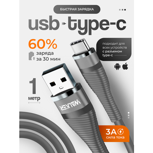 Найти - Кабель для зарядки WALKER C735, С БЫСТРЫМ ЗАРЯДОМ 3.1 А в силиконовой оплетке, разъём Type-C, серый, 1 метр, шнур usb питания для телефона андроид