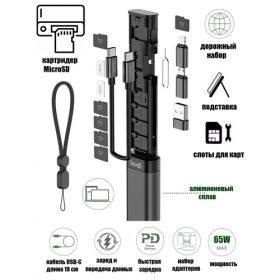 Мультикабель (6 типов кабелей) с поддержкой протокола быстрой зарядки Power Delivery. Кабель USB C - USB C длиной 18 см. 3 типа переходников - USB A - USB C, USB C - Micro-USB, USB C - Lightning. Также 6 слотов для microSD карточек, 2 слота для nanoSIM, скрепка для извлечение SIM карт, картридер для microSD, шнурок для переноски. Корпуса разъемов кабеля и переходников выполнены из металла. Каждый кабель может использоваться и для зарядки гаджетов (поддержка PD до 65Вт), и для передачи данных. Картридер имеет пружинный фиксатор, вытащить карточку можно только нажав на нее - это еще одно место для хранения карт, номер 7. Картридер имеет индикатором работы. При установке никакие драйвера не нужны, карта памяти определяется на подключенном компьютере мгновенно. Девайсы на Androidвоспринимают его как внешний носитель. Скорость передачи и чтения 30Mb/s. Выдвижная пластиковая подставка для телефона, ширина 15 мм. Позволяет использовать смартфон как вертикально, так и горизонтально.