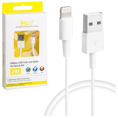 Кабель USB Lightning 2 метра для iPhone / iPad / iPod / Apple Watch от проверенного бренда ISA предназначен для зарядки устройств Apple, имеющих разъём Lightning 8 pin или их синхронизации с ПК или ноутбуком. При производстве кабеля применяется уникальная высокоточная система пайки. Разъём в своей основе оборудован дополнительной металлической скобой, плотно фиксирующей место пайки кабеля к разъёму, улучшающей экранирующие свойства шнура и повышающей показатели по передаче данных при тесте ATS. Дополнительной защитой микросхемы разъёма от физических воздействий служит плотная ПВХ оболочка, которая дополнительно фиксирует место пайки. Оплёткой кабеля служит медная оболочка, максимально улучшающая экранирующие свойства.