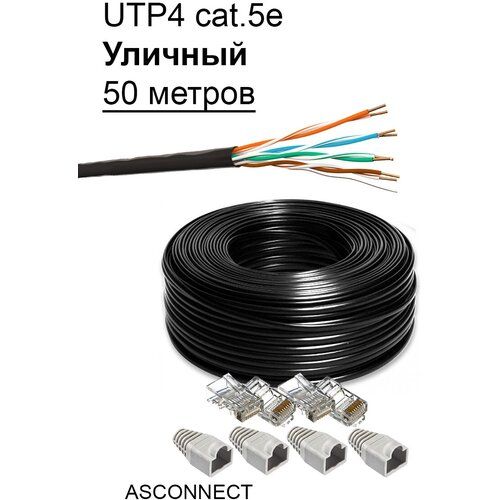 НАЙТИ ВЫГОДНЕЕ - Комплект: Интернет кабель уличный витая пара UTP4 cat.5e, одножильный с коннектором rj45 и колпачками rj45, 50 метров