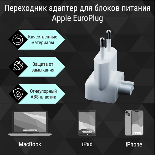 Переходник для блока питания Apple Euro Plug представляет собой высококачественный адаптер, который позволяет использовать зарядные устройства с разъемами EU с блоками питания от Apple.
