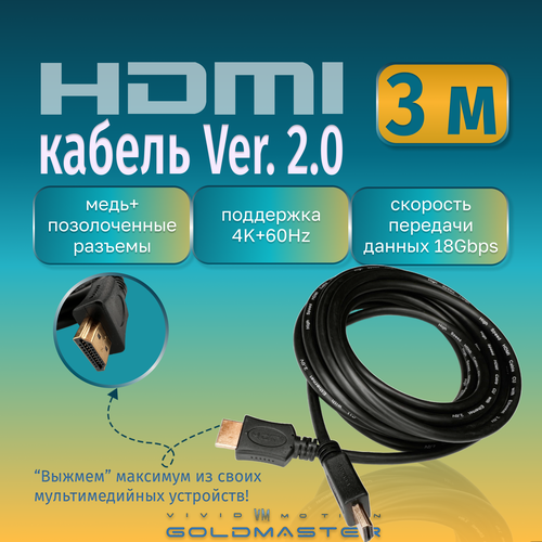 НАЙТИ ВЫГОДНЕЕ - Кабель GoldMaster HDMI 3м Шнур HDMI - HDMI - 3м Ver 2.0, GoldMaster с позолоченными коннекторами