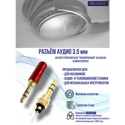 Найти - Разъем аудио 3.5мм штекер стерео металл позолоченный на кабель в мини корпусе, красный