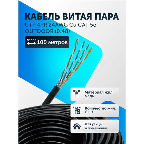 - Интернет кабель уличный витая пара 100м UTP Cat.5e outdoor — надежное решение для подключения к сети в любых условиях. Кабель изготовлен из высококачественных материалов, устойчивых к воздействию влаги, перепадам температур и ультрафиолетовому излучению, подходит как для использования внутри помещений, так и на улице.