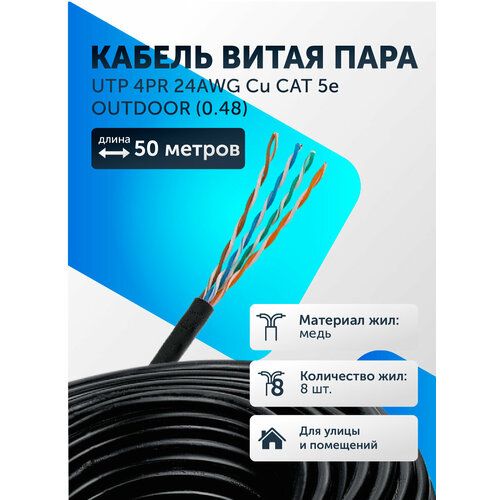 - Интернет кабель уличный витая пара 50м UTP Cat.5e outdoor — надежное решение для подключения к сети в любых условиях. Кабель изготовлен из высококачественных материалов, устойчивых к воздействию влаги, перепадам температур и ультрафиолетовому излучению, подходит как для использования внутри помещений, так и на улице.