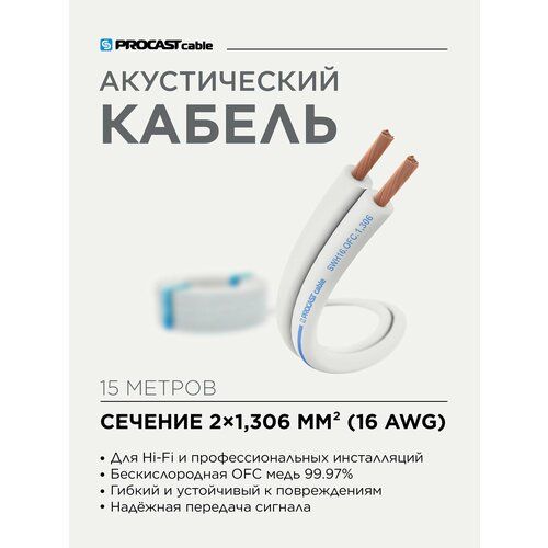 PROCAST cable SWH 16. OFC.1,306 – профессиональный акустический (спикерный) кабель для подключения акустических систем к звукоусиливающему оборудованию. Проводники изготовлены из сверхчистой бескислородной меди OFC – 99,97% и имеют ультра-многопроводниковую структуру (каждая жила состоит из 65 проводника диаметром 0,16 mm). Сечение каждой жилы – 1,306 mm2 (16AWG). Внешняя изоляция спикерного кабеля PROCAST Cable SWH 16. OFC.1,306 изготовлена из качественного и долговечного пластиката (PVC) окрашенного в белый цвет. Это позволяет подключить белую корпусную акустическую систему, установленную на стене белого цвета, абсолютно незаметно (без традиционно торчащих за колонкой цветных акустических кабелей). Жилы легко разделяются и зачищаются. Диапазон рабочих температур для изоляции -40 / +70 °C.