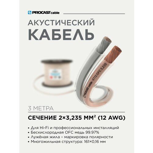 PROCAST cable ST 12. OFC.3,235 – профессиональный Hi-Fi акустический (спикерный) кабель для подключения акустических систем к звукоусиливающему оборудованию. Кабель может быть использован для подключения low-impedance (4-16 ohm) динамиков любой мощности в Hi-Fi / Hi-End мультирум системах, стереосистемах и системах элитного домашнего кинотеатра, а также в любых других профессиональных аудио инсталляциях. Проводники изготовлены из сверхчистой бескислородной меди OFC – 99,97% и имеют ультра-многопроводниковую структуру (каждая жила состоит из 161 проводников (7х23) диаметром 0,16 мм). Сечение каждой жилы – 3,235 mm2 (12AWG). Внешняя изоляция спикерного кабеля PROCAST Cable ST 12. OFC.3,235 изготовлена из качественного и долговечного прозрачного пластиката (PVC), для удобства определения полярности одна жила луженая. Жилы легко разделяются и зачищаются. Диапазон рабочих температур для изоляции -40 / +70 °C.