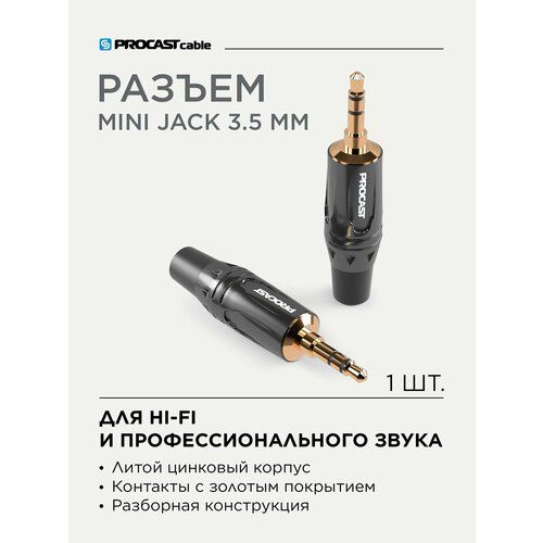 PROCAST cable MP-3.5/6/M/M – разборный трехконтактный стерео разъем под пайку mini Jack 3,5 mm. Разъем имеет разборный черный металлический корпус. Внутренние контакты со специальным покрытием хорошо паяются. Для плотного примыкания к приходящему кабелю PROCAST MP-3.5/6/M/M имеет пластичный резиновый наконечник. Внешние рабочие контакты разъема имеют золотое напыление (нитрид титана) и не подвержены коррозии.