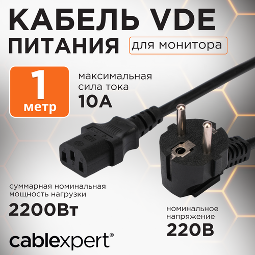 Кабель питания Cablexpert черный Schuko-C13 10A VDE с заземлением длина 1м PC-186-VDE-1M - это надежный и качественный продукт, который обеспечит стабильное электропитание вашей техники.