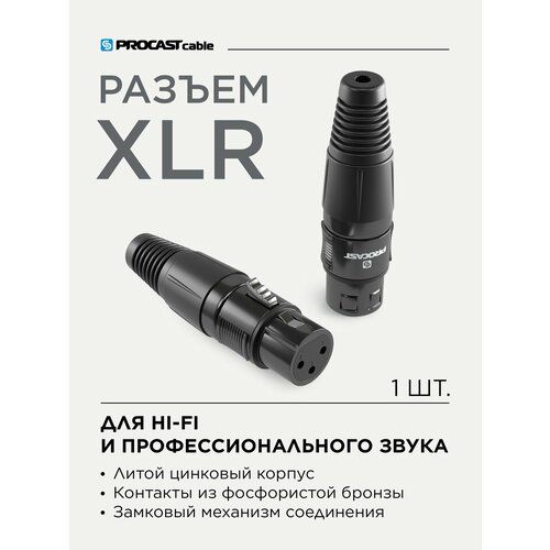 PROCAST cable XLR 6/ Female – XLR (female) разъем (гнездо) под пайку. Разъем трехконтактный, балансный. Разъем рассчитан на применение с сигнальным / инструментальным / микрофонным балансным кабелем с внешним диаметром 6 mm. Отлично подойдет для коммутации профессионального звукового оборудования, межблочного соединения, подключения балансных микрофонов и электромузыкальных инструментов к усилителям, микшерам, активной акустике и так далее. Черный металлический корпус не подвержен коррозии. Контакты со специальным покрытием хорошо паяются. Для плотного примыкания к приходящему кабелю XLR 6/Female имеет пластичный резиновый наконечник. Внутри разъема присутствует пластиковая вставка для дополнительной фиксации кабеля и изоляции места соединения от корпуса.