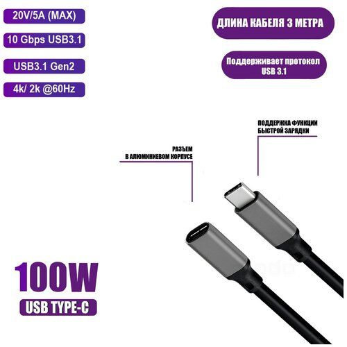 Найти - Кабель USB Type-c, удлинитель 3 м, черный