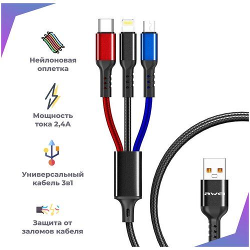 Универсальный кабель для зарядки смартфона 3 в 1. Кабель USB Type C + Lightning + Micro USB.