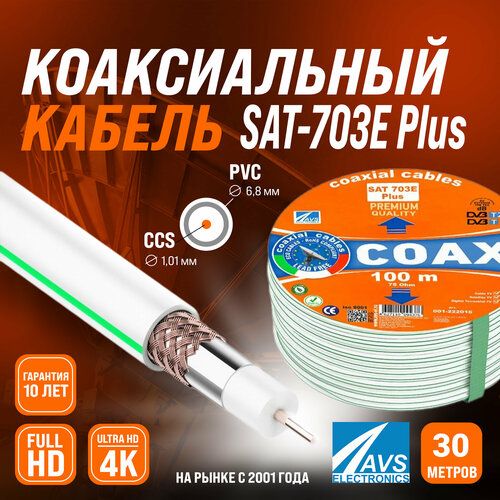 Коаксиальный телевизионный кабель 30 м SAT 703E Plus CCS AVS Electronics антенный провод для спутниковой тарелки, цифрового, эфирного тв 30 метров 001-222016/30. SAT 703 E Plus AVS Electronics - коаксиальный кабель, предназначенный для передачи высокочастотных сигналов. Чаще всего применяется при подключении кабельного, спутникового и эфирного цифрового телевидения. Оптимален для TV/DVB/DVB-S2/DVB-T2/HD.