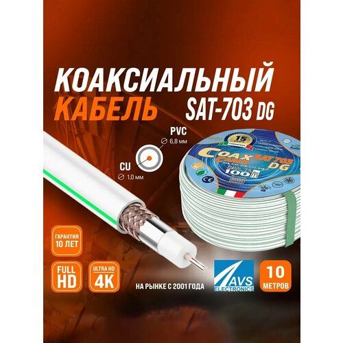 Найти - Медный телевизионный коаксиальный кабель 10 м SAT-703 DG Cu AVS Electronics провод для антенны спутниковой тарелки, цифрового, эфирного тв 10 метров 001-222006/10