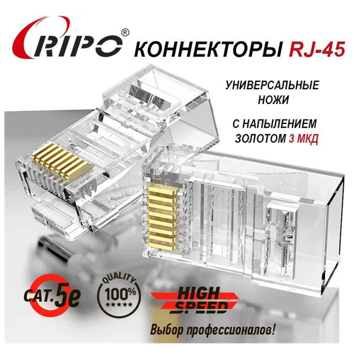 Найти - Коннектор RJ45 для витой пары разъём RJ-45 штекер TP-8P8C UTP CAT5e покрытие золото 3 мкд универсальные ножи Ripo 20 шт в упаковке 003-400021/20