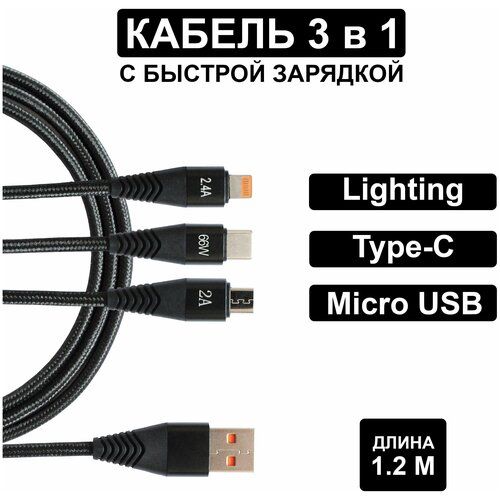 НАЙТИ ВЫГОДНЕЕ - Кабель для быстрой зарядки 3 в 1(Lightning, Type-c, Micro USB)Quick Charge 3.0/Samsung AFC/Pump Express/Huawei FCP/Передача данных по Type-C
