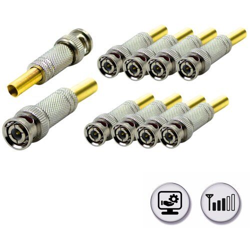 Разъем штекер BNC под винт с пружиной предназначен для подключения коаксиального кабеля c волновым сопротивлением 50 или 75 Ом, диаметром до 7мм к видеокамерам, видеорегистраторам, мониторам и другим радиоэлектронным устройствам. BNC разъемы обычно используются в медицинском оборудовании, измерительной аппаратуре, аналоговом и цифровом интерфейсах, а также для коммутации телевизионных кабелей.