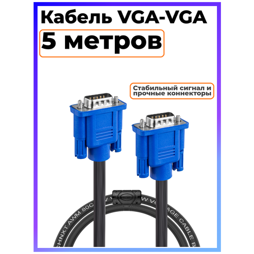 Кабель VGA-VGA 5 метров (штекер-штекер) для мониторов, проекторов и пр. Профессиональный сигнальный кабель для подключения монитора с интерфейсом VGA к видеоадаптеру с разъёмом VGA. Высокоскоростной соединительный кабель VGA 15 Pin - VGA 15 Pin.