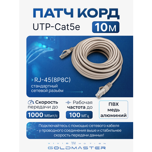 НАЙТИ ВЫГОДНЕЕ - Патч-корд 10 м Голд Мастер UTP 5е RJ45 интернет кабель 10 метров LAN сетевой Ethernet патчкорд серый (NA102--10M), контакты blade с позолотой 03FU