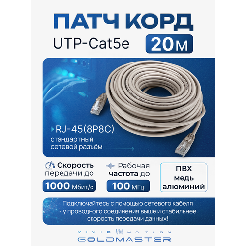 НАЙТИ ВЫГОДНЕЕ - Патч-корд 20 м Голд Мастер UTP 5е RJ45 интернет кабель 20 метров LAN сетевой Ethernet патчкорд серый (NA102--20M), контакты blade с позолотой 03FU
