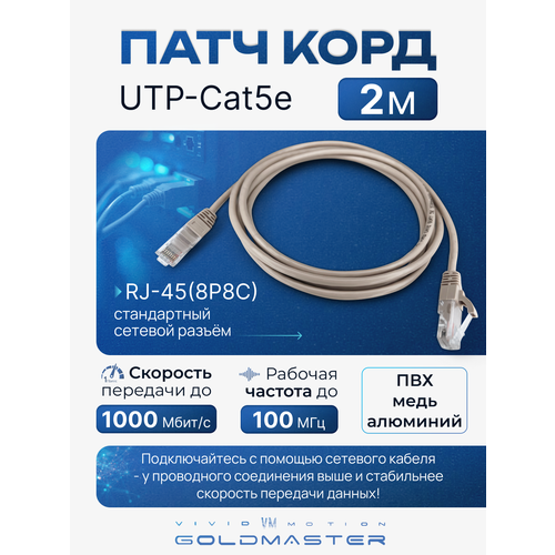НАЙТИ ВЫГОДНЕЕ - Патч-корд 2 м Голд Мастер UTP 5е RJ45 интернет кабель 2 метров LAN сетевой Ethernet патчкорд серый (NA102--2M), контакты blade с позолотой 03FU