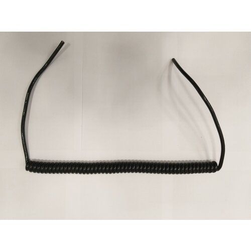 Спиральный кабель полиуретановый 2х0,25+5х0,12 с экраном. Количество жил и сечение: 2 по 0,25 мм кв + 5 по 0,12 мм кв. Диаметр кабеля: 6,7 мм. Диаметр спирали: 23 мм. Длина спирали: 330 мм, растягивается до 1000 мм. Коэффициент растяжения: 3 раза. Длина I прямого конца: 250 мм. Длина II прямого конца: 250 мм. Токопроводящая жила (ТПЖ): из медных проволок согласно VDE 0295 класс гибкости 5 и выше. Изоляция жил: PVC или РЕ. Маркировка жил: VDE 0293 или белые с цифровой маркировкой. Экран: медная проволока или луженая медная проволока плотностью от 45 до 90%. Наружная оболочка: полиуретан типа 11YM1. Цвет: черный. Кабель стоек к воздействию масел, к порезам, износу, температурным перепадам. Диапазон рабочих температур: +5С - +80С. Вес: 220 г.