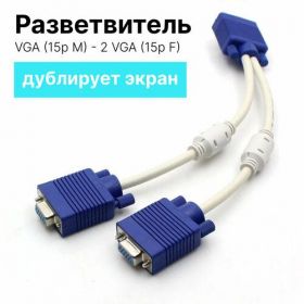 Разветвитель VGA на 2 VGA (1 разъем -2 штекера) дублирует сигнал и позволяет передавать изображение на два экрана одновременно (дублирует).