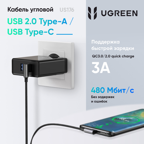 Найти - Кабель UGREEN US176 (20855) Right Angle USB-A to USB-C Cable 0.5m - Black