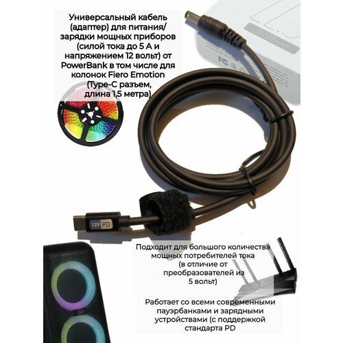 Кабель питания 12 В (Type-C - DC 5,5*2,5(2,1) мм, 5А) разработан для надежного питания и зарядки устройств от пауэрбанков и зарядных устройств с поддержкой протоколов PD2.0/3.0. Подходит для питания мощных потребителей тока, таких как портативные колонки Fiero Emotion 200/150/100, Ginzzu GM-111, GM-112, роутеры, проекторы, насосы и другие устройства с потребляемой силой тока до 5А.