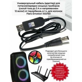 Кабель питания 12 В (USB - DC 5,5*2,5 (2,1) мм) предназначен для питания портативных колонок Fiero 150/100, Ginzzu GM-111, GM-112 и других устройств с поддержкой протоколов быстрой зарядки QC 2.0/3.0. Идеален для автономного питания мощных потребителей, таких как роутеры, проекторы, насосы и другие устройства с потребляемой силой тока до 3А.