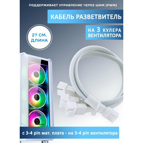 НАЙТИ ВЫГОДНЕЕ - Кабель разветвитель на 3 кулера/вентилятора на 3-4 pin. PWM, 27см белый в оплетке, удлинитель вентилятора