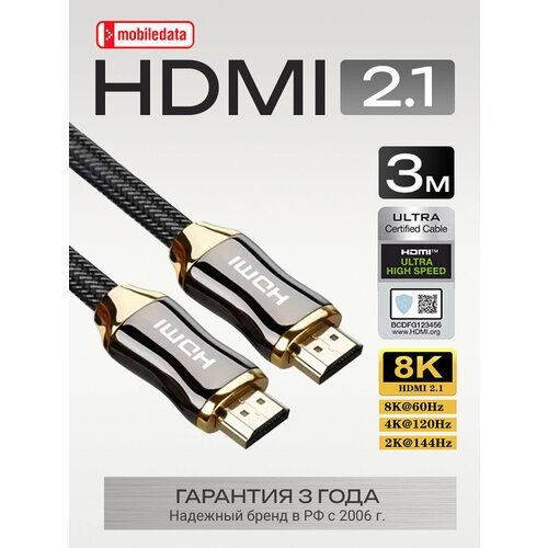 Высокоскоростной кабель нового поколения HDMI 8K версии 2.1 применяется для соединения компьютеров, Blue-Ray и DVD плейеров, игровых консолей, видео и фото камер с телевизорами, мониторами, видео проекторами и предназначен для передачи аудио и видео сигнала 1920x1080, 3840х2160, 4096х2160, 5120х2880, 7680х4320 ,10328х7760 пикселей и максимальной пропускной способностью канала до 48 Гбит. Контент стандарта 8К передается по кабелю HDMI без сжатия, для видеоизображения стандарта 10К применяется сжатие DSC 1.2 (Display Stream Compression). Полностью поддерживает режимы 3D, HDSP 2.2 , Динамическое HDR , Ethernet , eARC. Кабель изготовлен из высококачественных компонентов. Имеет надежную нейлоновую оплётку.
