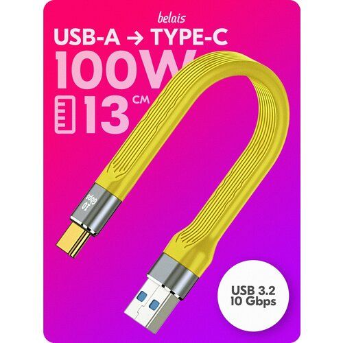Кабель короткий сверхскоростной USB A — TYPE-C «belais» (10 Gbps, 100W, USB 3.2, 13 см, жёлтый) belais #22300