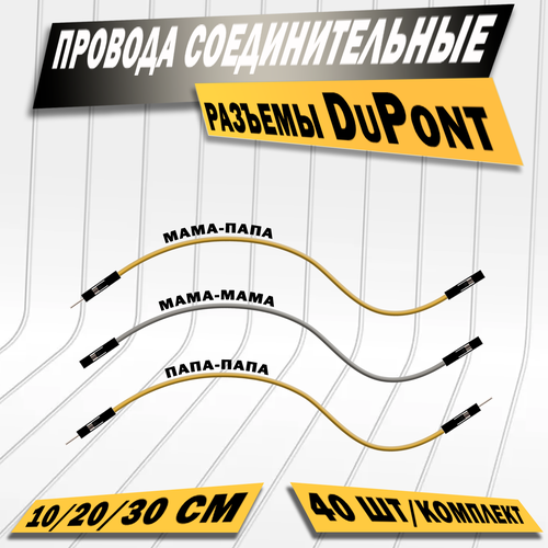 Провода соединительные DuPont папа-мама 20см представляют собой комплект из 40 штук, предназначенных для удобного подключения контроллеров, датчиков, светодиодов и других DIP компонентов.
