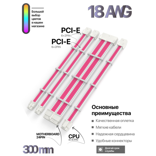 НАЙТИ ВЫГОДНЕЕ - Комплект кастомных удлинителей для блока питания 30 см розовый 24 Pin, 4+4 pin, 6+2x2 PCI-E c гребенками