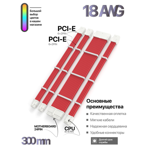 НАЙТИ ВЫГОДНЕЕ - Комплект кастомных удлинителей для блока питания 30 см красный 24 Pin, 4+4 pin, 6+2x2 PCI-E c гребенками