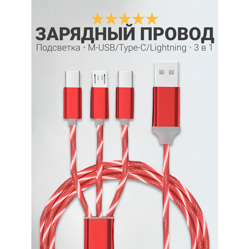 НАЙТИ ВЫГОДНЕЕ - Зарядный кабель для iPhone, Android, iPad, Xiaomi, Meizu, 3 в 1, Type-C, Micro-USB, Lightning, светящийся, красный