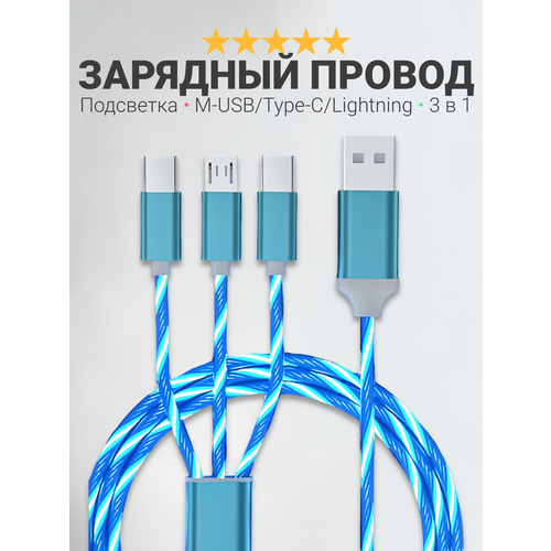 НАЙТИ ВЫГОДНЕЕ - Зарядный кабель для iPhone, Android, iPad, Xiaomi, Meizu, 3 в 1, Type-C, Micro-USB, Lightning, светящийся, синий