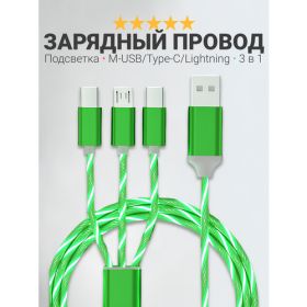 Найти - Зарядный кабель для iPhone, Android, iPad, Xiaomi, Meizu, 3 в 1, Type-C, Micro-USB, Lightning, светящийся, зеленый