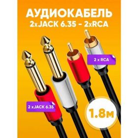 Кабель-разветвитель 2х Jack 6.3 мм штекер - вилка 2xRCA 1.8м. Компонентный кабель 2х AUX мама - 2хRCA мама. RCA кабель подходит для подключения акустических систем, синтезатора, колонок, бытовой аудиоппаратуры, видеомагнитофонов, двд плееров и другиз периферийных аксессуаров. Шнур AUX JACK 6.35 мм совместим с колонками, ресивером, микшерным пультом, синтезатором. Хорошая передача сигнала благодаря высококачественным медным проводникам с чистотой 99,97% и низким сопротивлением. Кабель с двумя тюльпанами и двумя штекерами JACK для соединения компонентов звуковой аппаратуры и другого профессионального музыкального оборудования. Шнур имеет длину 1.8м. Спиральное медное экранирование для бесшумной работы. Провод имеет разъемы: JACK 6.35mm [мама] - 2RCA [мама]. Вилка надежно фиксируется в стандартных гнездах. Подходит для передачи аналогового сигнала. Кабель AUX – тюльпан используется для совместной эксплуатации домашней и профессиональной аудиоаппаратуры: колонки, двд, микрофон, электронные музыкальные инструменты, плеер, усилитель звука, телевизор, видеоприставка, ресивер, спутниковый ресивер, DVB-T2 приставка. Используется высококачественная медь, что гарантирует превосходную передачу сигнала. Недорогой сверхнадежный кабель как для профессионалов в области звука, так и для музыкантов, которые хотят получить богатый звук и широкий динамический диапазон для различных инструментов и звуковых устройств.