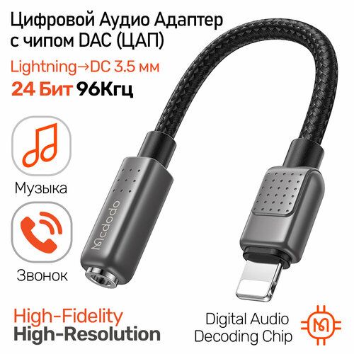 Цифровой Аудио Адаптер с чипом ЦАП (DAC), iP Lightning (п) на AUX Jack 3.5 мм (м) c поддержкой звонка, Digital Audio Decoding Chip Hi-Res Audio, Mcdodo CA-501, цинковый сплав