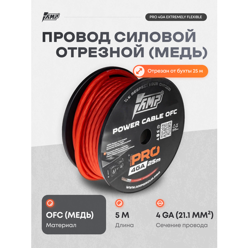 НАЙТИ ВЫГОДНЕЕ - Провод силовой AMP PRO 4Ga OFC Extremely flexible Красный медь 100% 5 метров