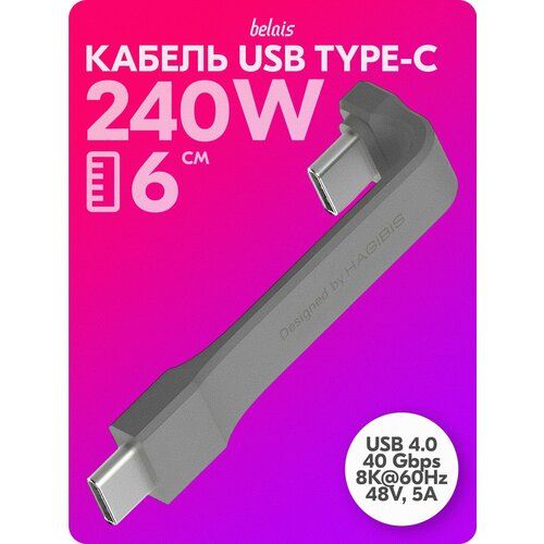Кабель короткий сверхскоростной TYPE-C Thunderbolt «Hagibis» (40 Gbps, 240W, USB 4.0, 8K@60 Hz, 6 см) belais #22818