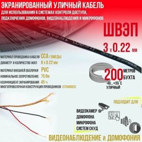 НАЙТИ ВЫГОДНЕЕ - Кабель швэп 3х0.22 (200м.)экранированный уличный для использования в системах контроля доступа, подключения домофонов, видеонаблюдения и микрофонов (бухта 200м.)