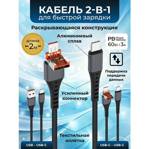 Кабель 2 в 1 длиной 2 метра Type-C на Type-C / USB-A - Type-C совместим с протоколами быстрой зарядки. Максимальная выходная мощность для USB-C - USB-C - 60 Вт, для USB-A - USB-C - 36 Вт. Поддерживает двустороннюю скорость передачи данных USB 2.0 480 Мбит/с.