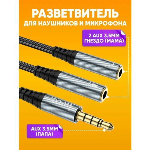 Переходник AUX разветвитель для наушников и микрофона 2 в 1 Hoco UPA21. Аудио кабель-адаптер UPA21 для 3,5 мм "мама" на 2*3,5 мм "папа", алюминиевый сплав + нейлоновая оплетка, 25 см. Материал провода AUX: алюминиевый сплав + высокопрочный нейлон. Сигнал от гнезда 3,5 мм переходника для наушников разделяется на два отдельных штекера 3,5 мм для микрофона и наушников. Аудио разветвитель Hoco UPA21 - Аудио кабель длиной 0,25 метра с металлическими штекерами и тканевой оплёткой, обеспечивает передачу чистого звука. Позолоченные интерфейсы гарантируют износостойкость и прочность. Разветвитель переходник AUX подходит для широкого спектра устройств: аудио и телевизионная техника, игровые приставки, монитор, мобильные телефоны, устройства Apple и Android, фото и видеотехника, электронные книги. Адаптер для планшетов, смарт-часов, смартфонов выручит в любой ситуации. Провод аудио адаптер jack 3.5 мм незаменим при использовании дома, на природе, в офисе, дороге.