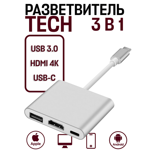 НАЙТИ ВЫГОДНЕЕ - Многопортовый кабель-адаптер переходник TECH разветвитель Type-C - 3 в 1, USB 3.0 — HDMI 4K / USB 3.0 / USB-C, белый